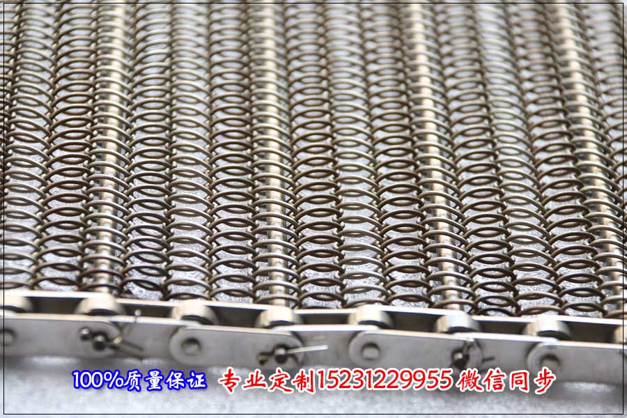 金屬網帶加裝穿桿后能明顯的加強網帶整體的負荷能力,根據不同的輸送要求,中間加裝各種結構形式的螺旋型或者雙旋型金屬網帶,連接鏈鉤,連接沖片、鏈板鏈接等達到很好的運載和運輸的效果。 所有的鏈條型號都有對應的鏈鉤配置,鋼絲直徑可以根據客戶要求任意選擇,金屬網帶密度可以根據輸送要求任意制作,所以說這會成為在鏈條輸送網帶領域的多用型金屬網帶。