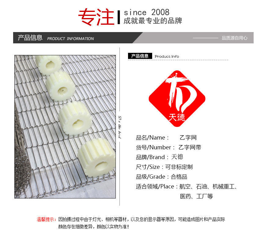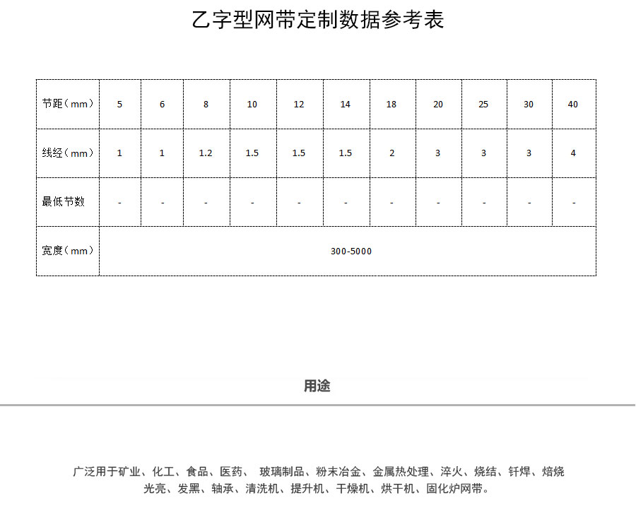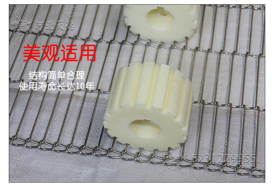 乙字網帶:又稱梯形網帶或一字網,此網帶通常系齒輪傳遞網帶,具有透氣性好的優點,拉力均勻,做工精細,此網帶具有轉動靈活、平穩性好、耐高溫、耐壓力、耐腐蝕、壽命 長等特點。主要用于餅干機圖層,輕物品輸送及電子回流焊等