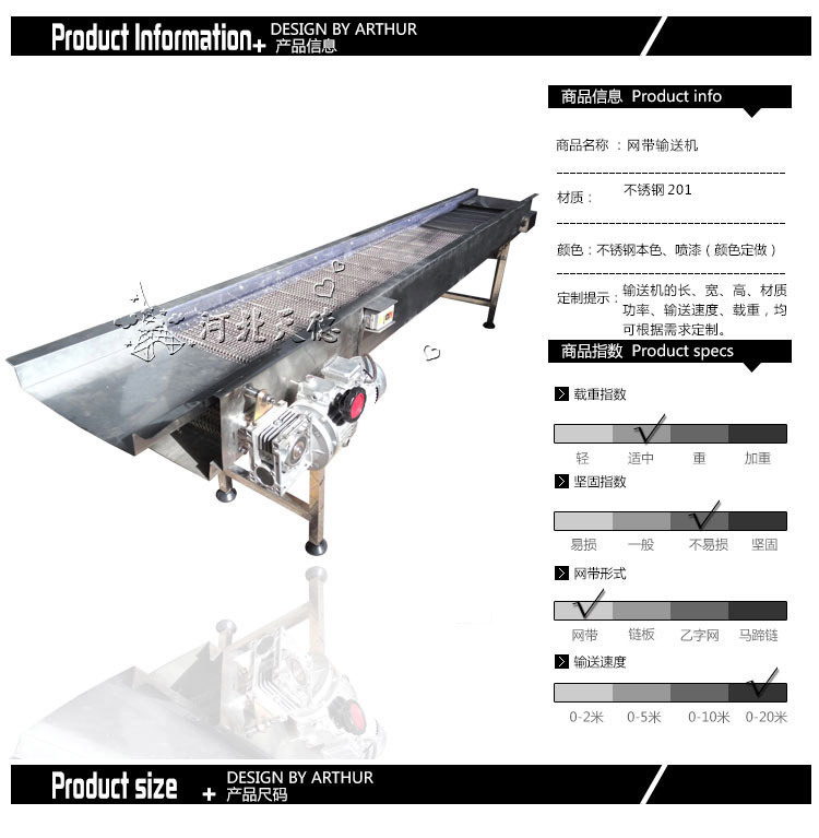適用范圍:廣泛應用于飲料瓶、鋁罐、藥品、化妝品、食品等行業的輸送,通過選用不同的網帶可以制作成儲瓶臺、提升機、殺 菌 機、蔬菜清洗機、以及肉食品輸送等行業專用設備。考慮網帶承受拉力限 制,單線長度一般不超過20米。