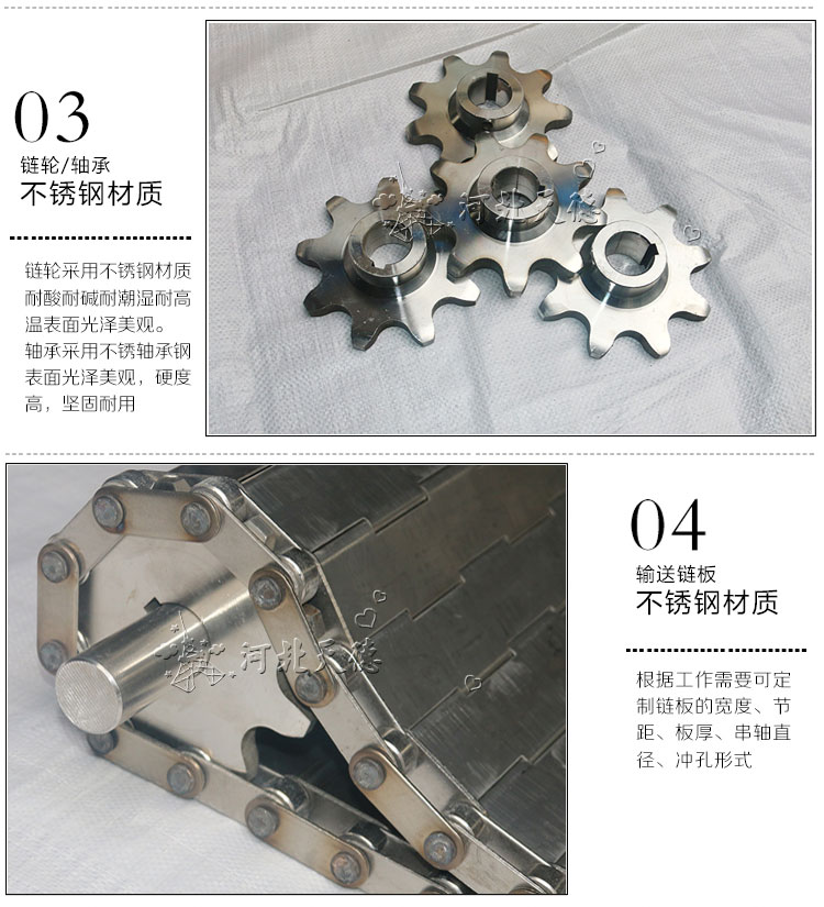 不銹鋼鏈板輸送機:采用金屬鏈板網帶作為輸送載體。驅動方式:減速電機驅動。